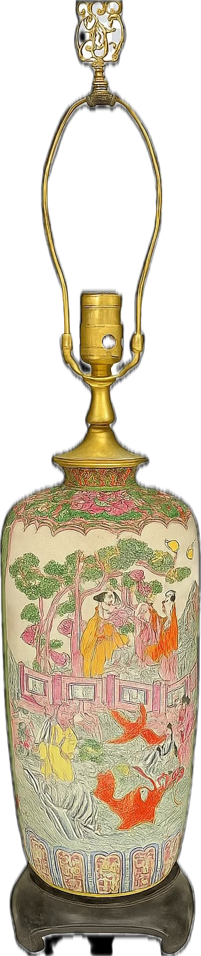 This tall, statement-making vintage lamp crafted from metal and finished with intricate artwork inspired by traditional Chinese storytelling. The body features a richly colored court scene with robed figures, birds, flowering trees, and stylized architectureโevoking tales of wisdom, beauty, and natural harmony.