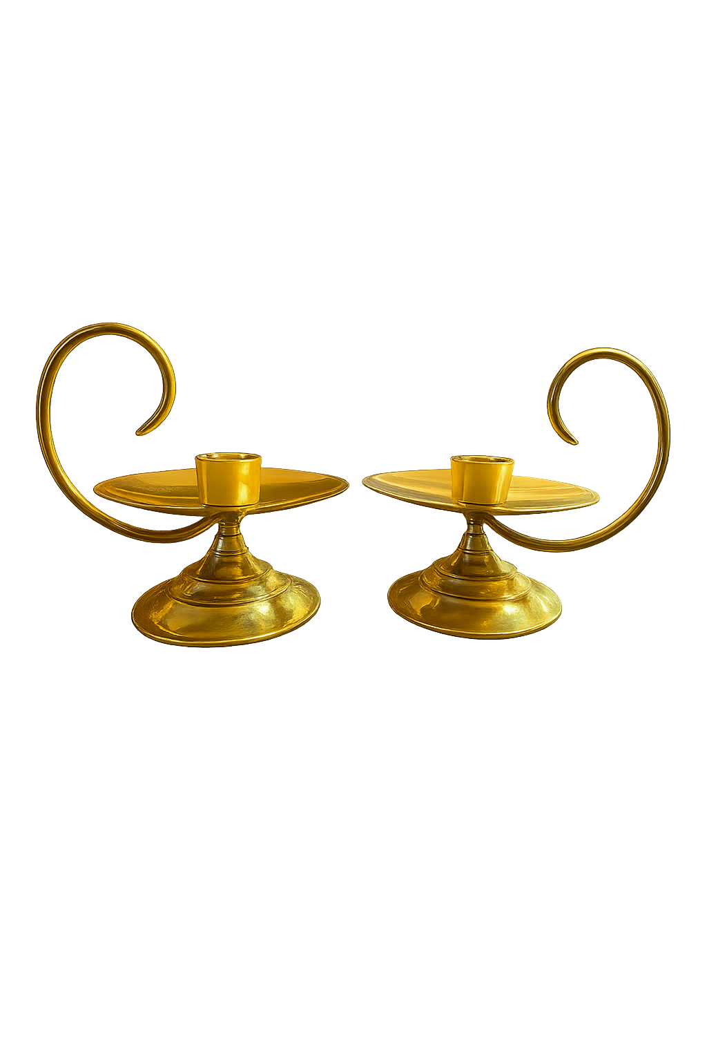 A gleaming pair of mid-century brass candle holders featuring wide drip plates and elegant swirl handlesโperfect for sophisticated, vintage-inspired dรฉcor.