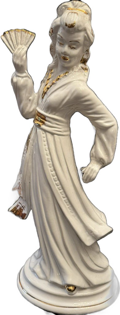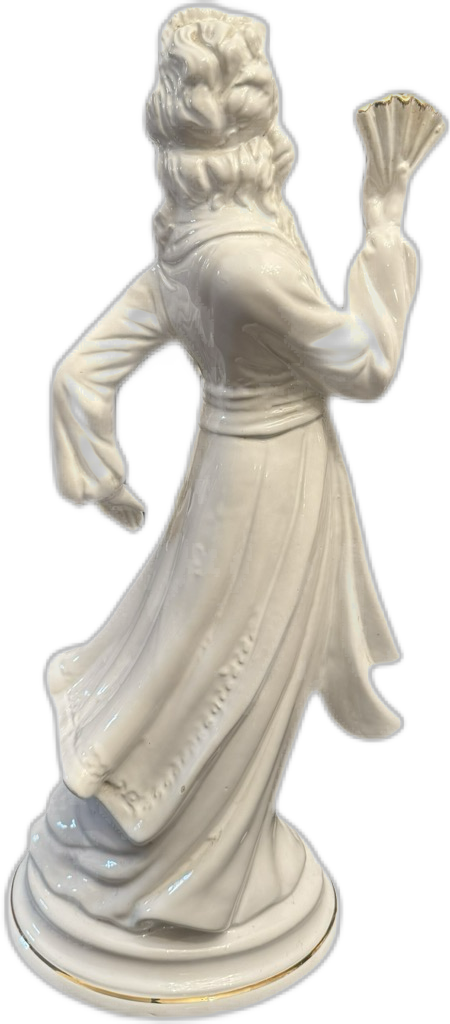 Perfect as a centerpiece for mantels, display cabinets, or curated vintage shelves, this figurine brings an air of grace and refinement to any space. Her white robe, highlighted with gold gilding at the belt, fan, and collar, subtly catches the light, adding a quiet shimmer. This is an ideal collectible for lovers of fine ceramics and timeless home décor.