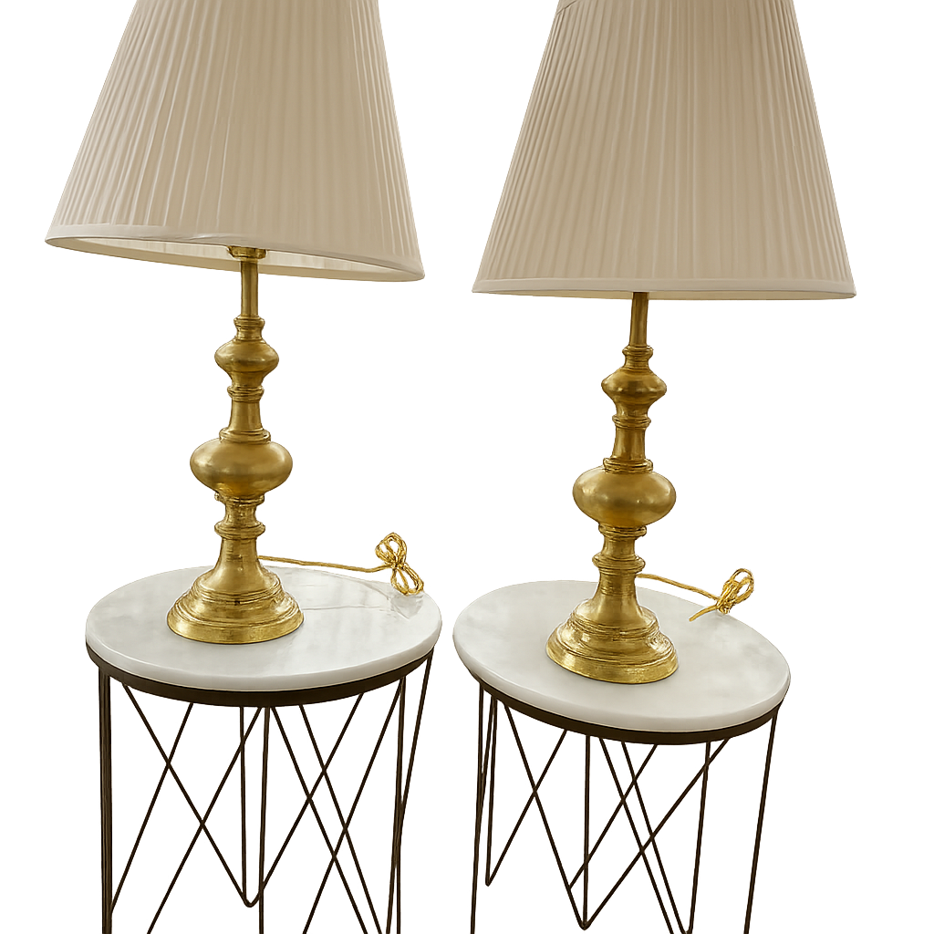 Elevate your space with this stunning pair of vintage gold brass table lamps. Featuring timeless silhouettes and crisp pleated shades, these lamps bring an elegant glow and classic charm to any room.